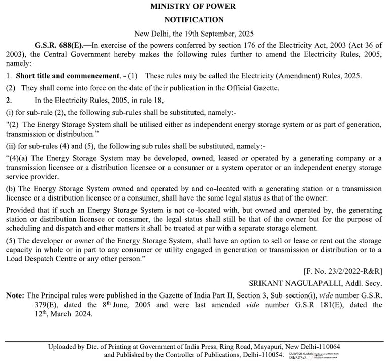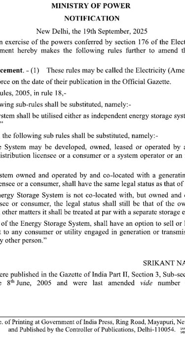 Latest Gazette Notification from MoP, GOI on Energy Storage System